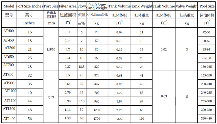 AT系列砂缸缸体采用环保优质的玻璃纤维作为原材料,结合手工工艺与进口机械技术加工而成,在日照,盐水等多种工作环境下,均体现出良好的产品性能。360度旋转顶阀(六位)设计,安装简易,方便使用。功能:正常过滤、反冲洗(排出过滤器内积蓄的污垢)、反冲洗后排出水管内剩余污垢,不经过滤直接排水、不经过滤循环。